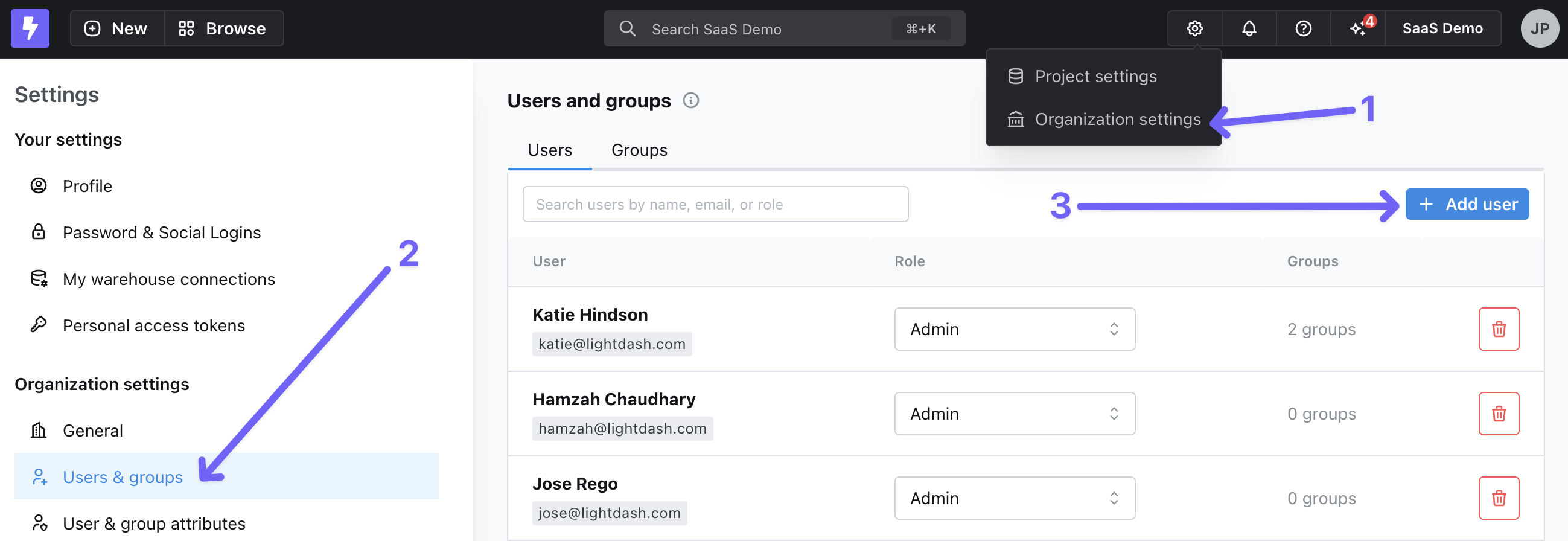 To invite your teammates individually, click on Organization settings —> Users & groups —> Add user.