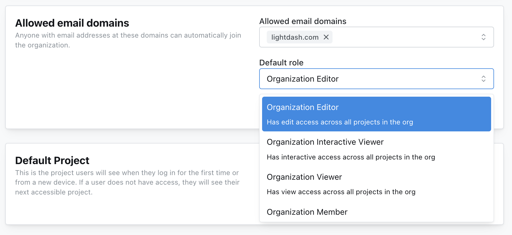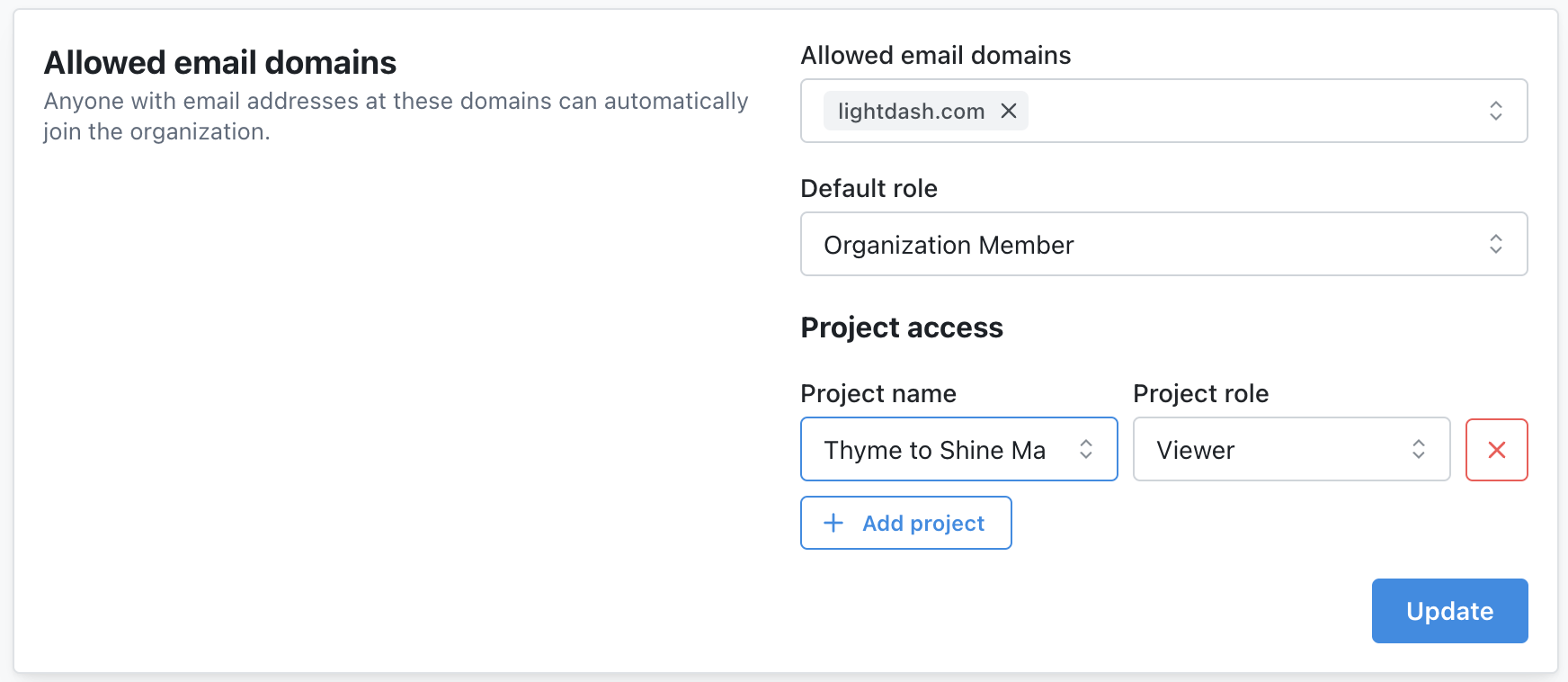 In the Allowed email domains panel, enter the email domain(s) you want to be able to automatically join your organization (e.g. here, we’ve added lightdash.com). Generic email domains like gmail.com or hotmail.com are not accepted. You can then select the access that you want these users to have by default. The organization Admin can always update a user’s permissions after they’ve joined!