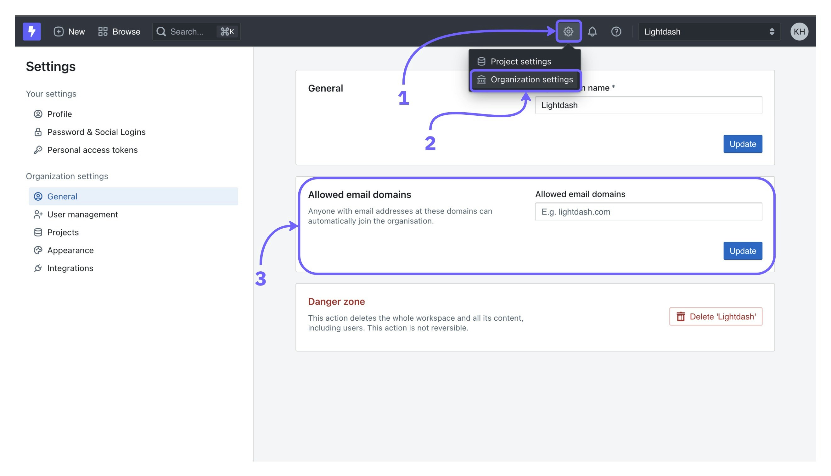 Organization admins can add allowed email domains to their organization settings so that anyone with those email domains can automatically join their organization (without explicitly inviting them). To update your organization’s allowed email domains setting, go to the General section of your Organization settings.