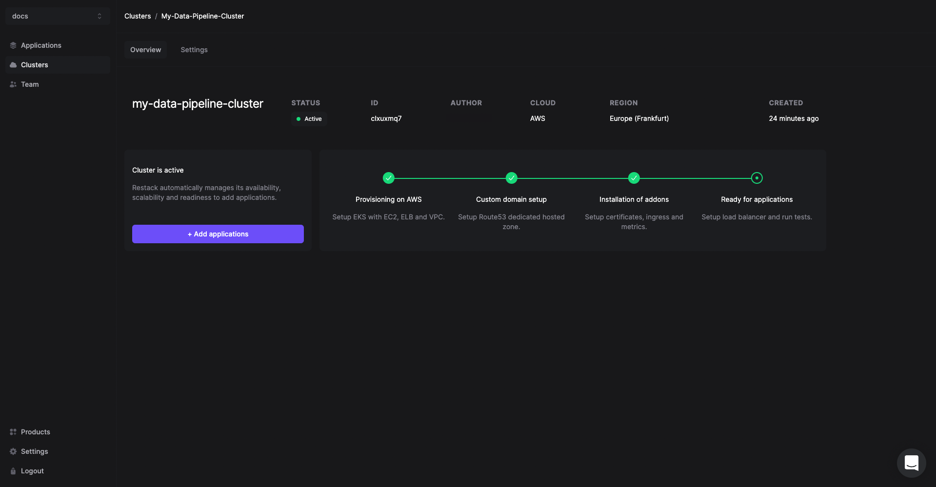 3. One-click cluster creation with Restack.